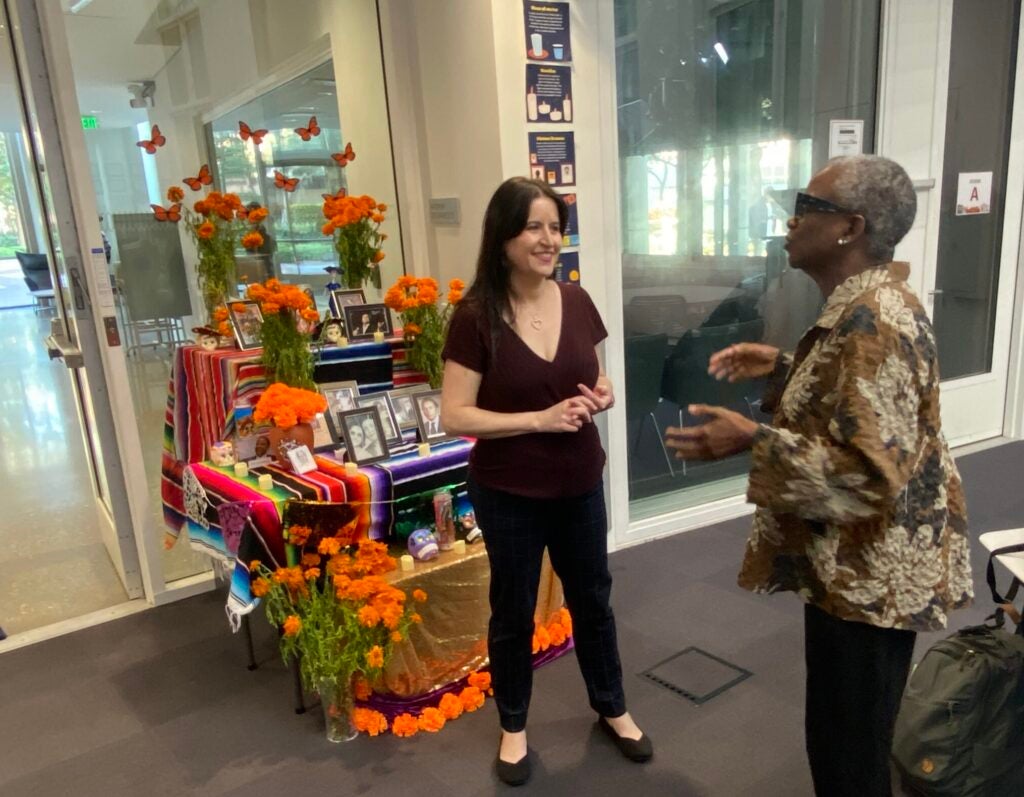 USC Annenberg’s Media Center Director Christina Bellatoni explains her students’ Dia de los Muertos installation to Dr. Kathleen McElroy during a visit in October. (Photo by Barbara Allen)